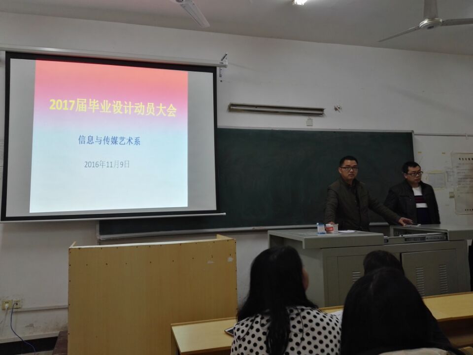 11月9日下午,信息与传媒艺术系在至诚楼1412教室召开2017届毕业生毕业设计动员大会,系主任王芳、副主任欧阳喜德、各教研室主任、毕业设计指导老师和135名毕业生出席。