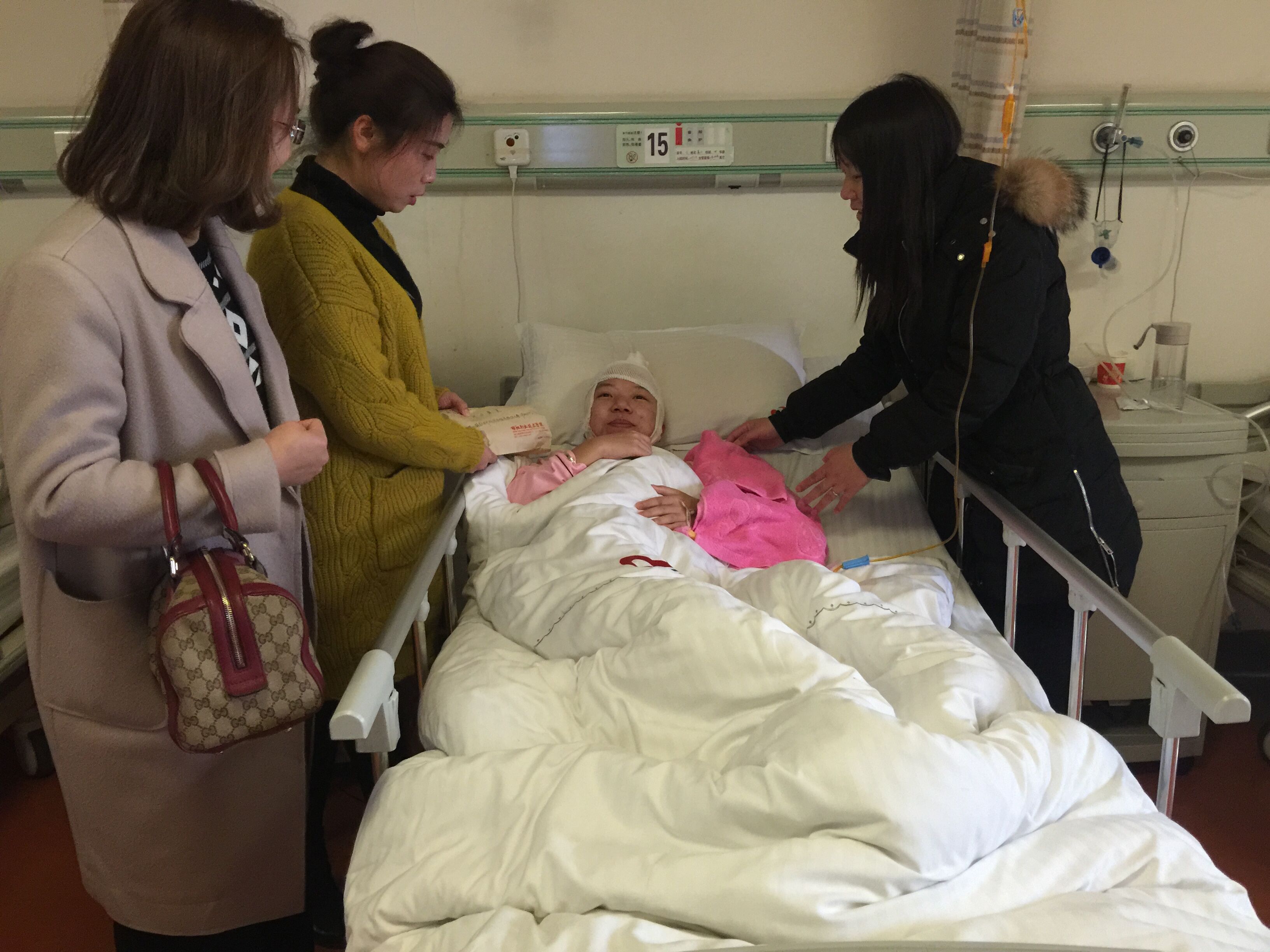 3月6日下午,工商管理系党总支书记肖艳群、辅导员马祯带着全院师生的问候,来到湖南省肿瘤医院看望因患脑骨瘤住院治疗的旅游1161班袁云同学。