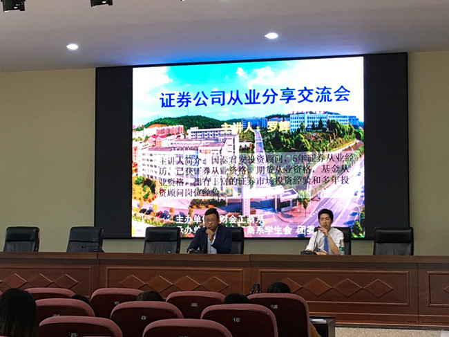 2018年4月17号,财会工商系与邵阳市国泰君安证券公司合作,在学院图书馆5楼报告厅成功举办证券投资分享交流大会。此次分享交流会财会工商系邀请了国泰君安投资顾问专家罗辉先生进行专题讲解,主办单位为财会工商系,承办单位为财会工商系团委、学生会。财会工商系主任肖炜、副主任杨哲、总支副书记钱洪华和金融专业全体师生参加了分享交流会。
