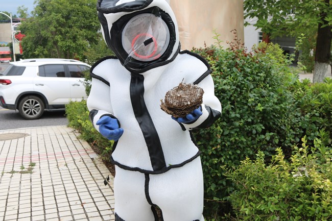 假期期间,学院沁园茶树球、主干道绿化带上有多个大型马蜂窝,有绿化工勤人员被蜇伤。马蜂窝所在地点是师生聚集、频繁经过的区域,若不及时清除,会给师生带来安全隐患。保卫处邓海浪穿上专业防护服,携带网兜、杀虫剂等工具赶赴现场,他先用网兜将蜂巢套住,娴熟地将马蜂窝连窝清理后又仔细查看周围,喷洒杀虫剂,肃清“残余势力”,此次除蜂行动共清理了沁园、实训楼主干道等处共计3个马蜂窝。在上学期,保卫处也已先后清除学院宿舍楼周边的马蜂窝5个,力求为全院师生创营造一个安全舒适的学习生活环境。