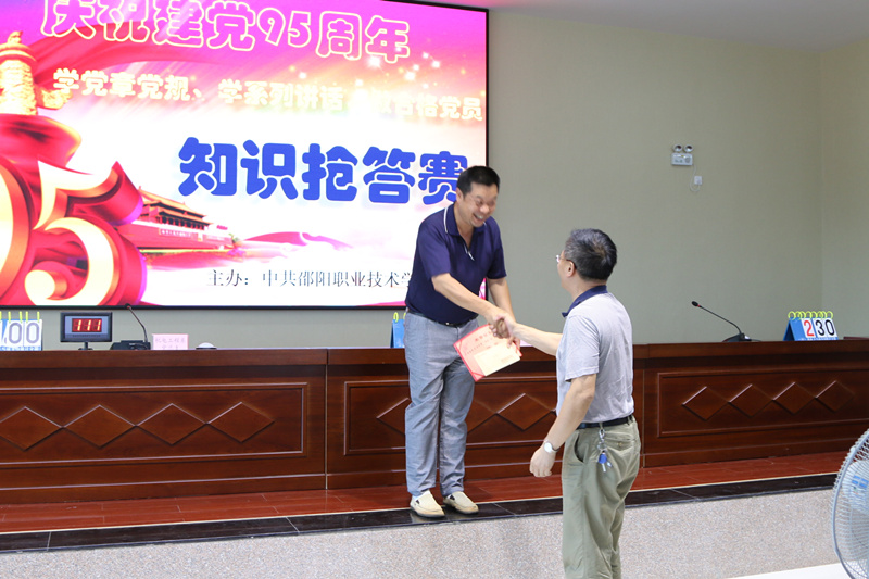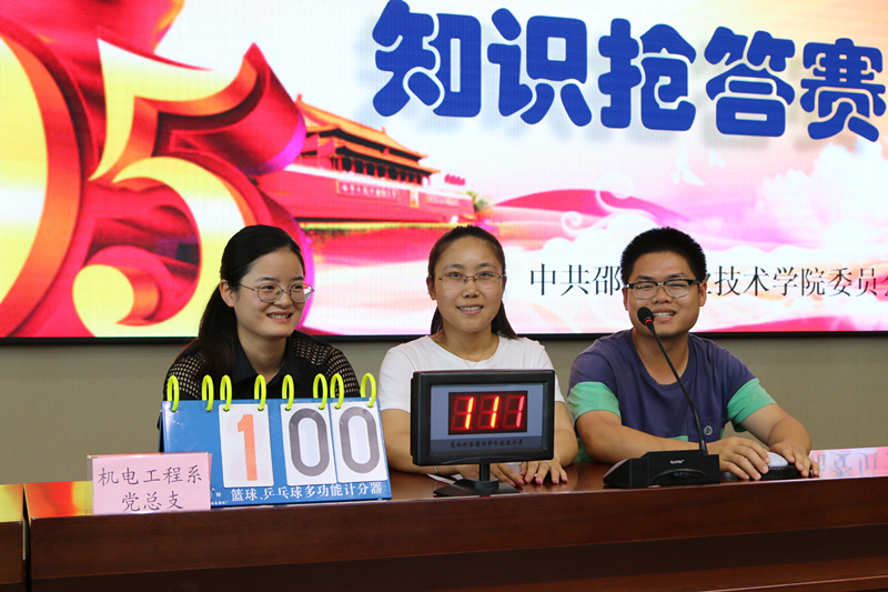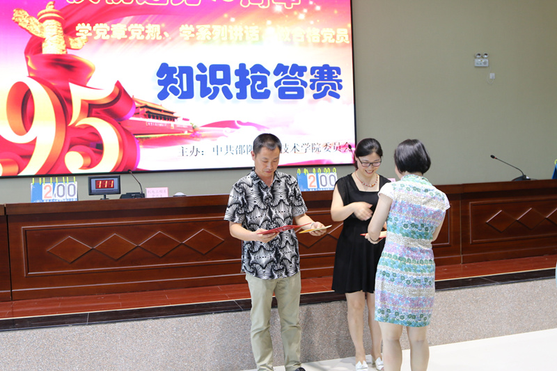 本次抢答赛分两组进行,11支参赛队通过抽签被分成两组,比赛名次的排定依据是各队的积分情况。比赛分必答题和抢答题两个环节,内容主要包括《党章》、《中国共产党纪律处分条例》、《中国共产党廉洁自律准则》和习总书记系列重要讲话等。在必答题环节,每位参赛队员基本上正确回答了三个问题,在抢答题环节,队员们争先按下抢答器以求获得答题加分的机会。整个比赛过程中,参赛队员们沉着冷静、回答准确,不时赢得观众的阵阵掌声。经过激烈角逐,学管党总支获得一等奖,工商管理系党总支、五年制大专部党总支获得二等奖,机关党总支、教学党总支、机电工程系党总支获得三等奖。(宣传部)