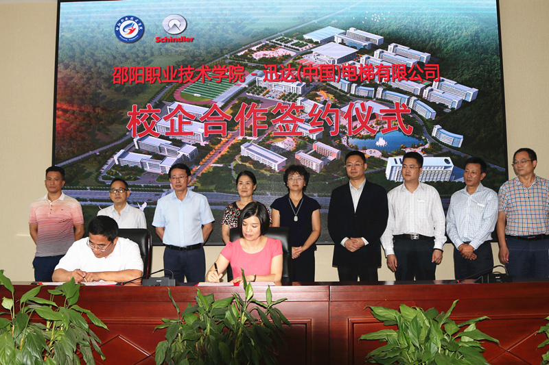 在所有与会领导和嘉宾的共同见证下,段雪梅和李志弘分别代表双方签署了校企合作协议。根据协议,双方在“优势互补、资源共享、互惠双赢、共同发展”的基础上进行合作,共建邵阳职业技术学院二级学院——电梯工程学院暨迅达区域培训中心。学院将按照行业、企业、岗位要求对学生进行培养,专业建设、教学模式、教学管理均以国际、欧美现代化模式为主导,实施“产学合一”“做学合一”“车间课室合一”“老师师傅合一”“校企文化合一”“校企发展合一”的“双主体、六合一”人才培养模式,形成学院学生学历教育培养、企业人员职业技能培训,并对社会提供技术服务的多形式深度联合办学体系。通过校企深度合作,将学院逐步建设成为全国电梯行业高端技能型人才培养基地。