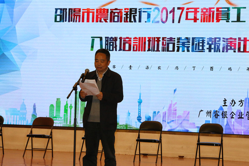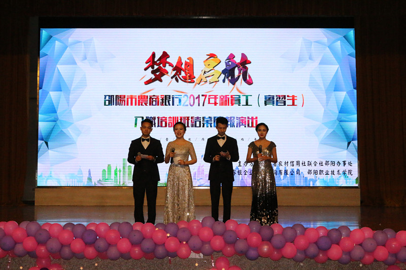 4月10日晚,邵阳市农村银行2017年新员工(实习生) “梦想之旅”入职培训班结业汇报演出在我院文体馆隆重举行。湖南省农村信用社联合社邵阳办事处党组书记、主任肖沪生,我院副院长周平、继续教育部主任何轶平以及卲阳市农村银行市(县)各地支行负责人及全体培训人员观看了演出。