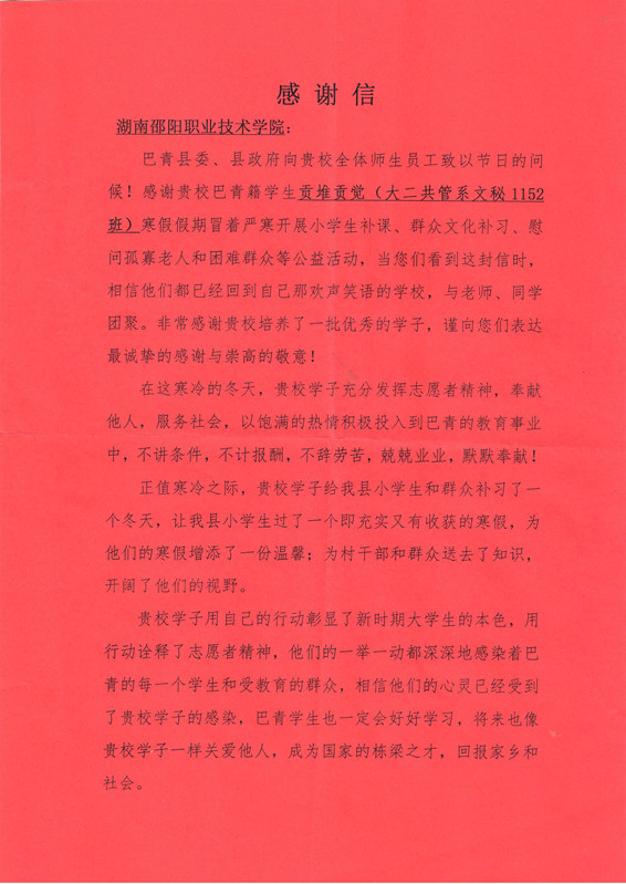2017年初,工商管理系文秘专业2015级1152班学生贡堆贡琼与同村的大学生一起在家乡那曲巴青进行了为期一个月的支教活动,当地教育部门特发来感谢信,感谢我院学子对当地教育事业所作的贡献!