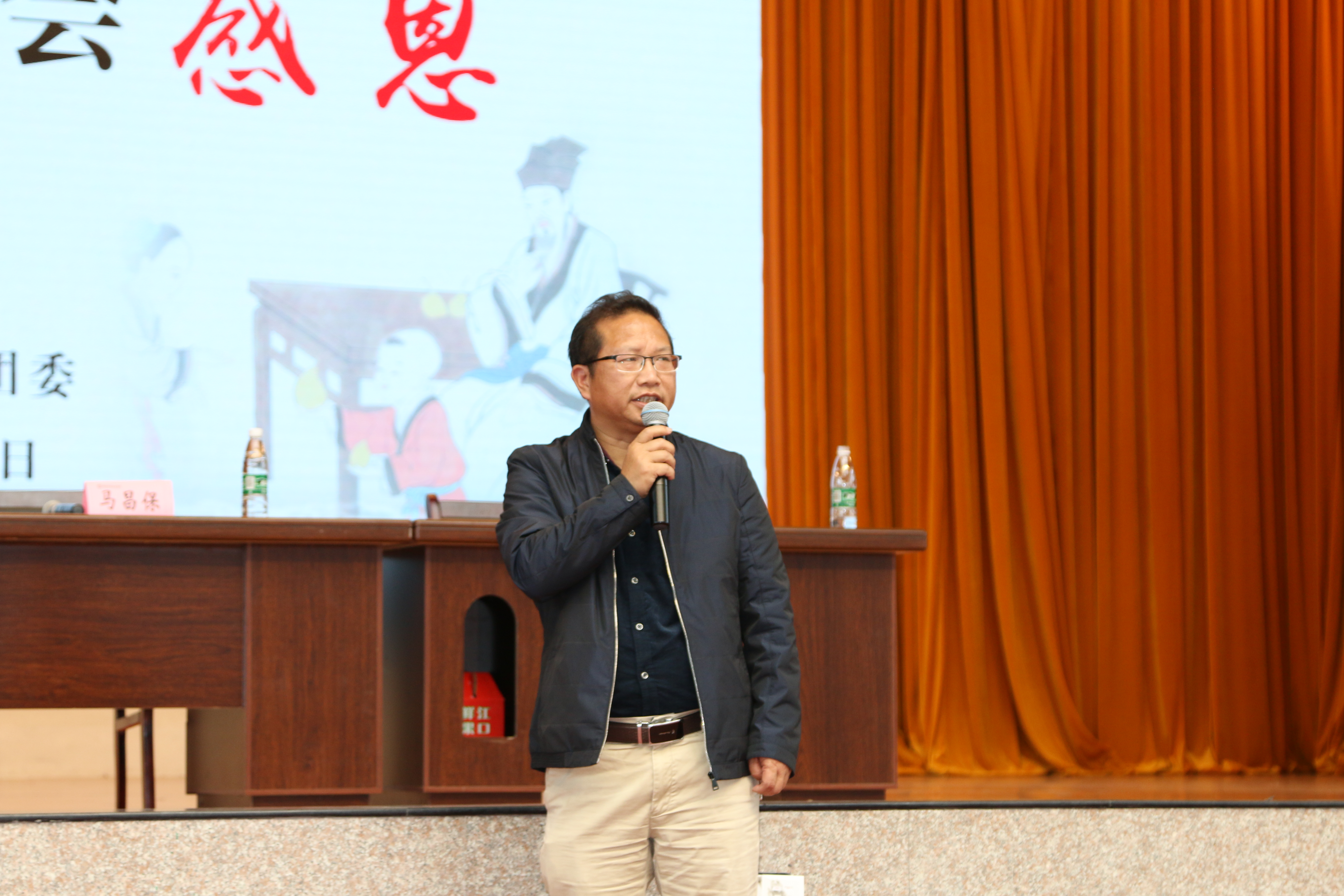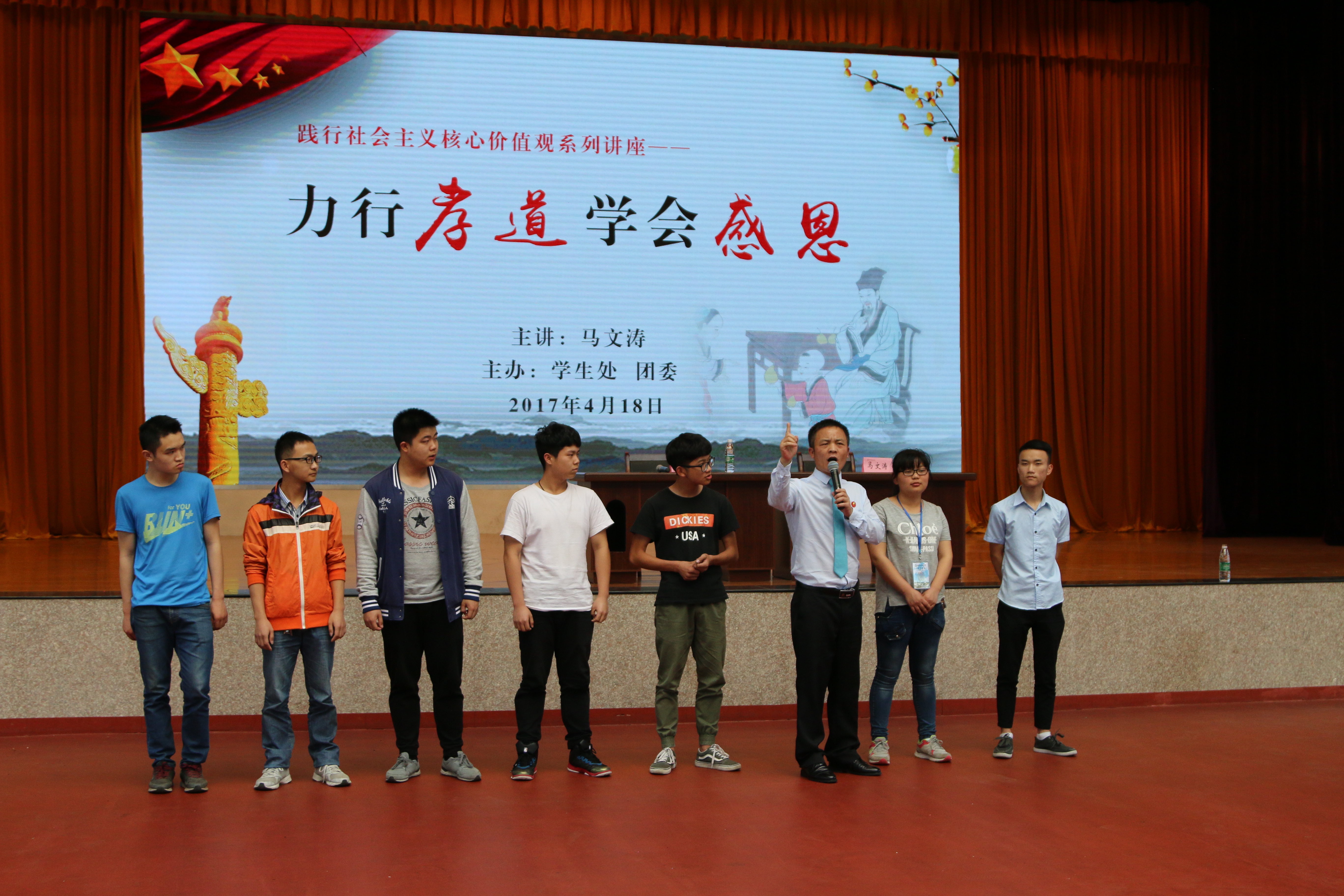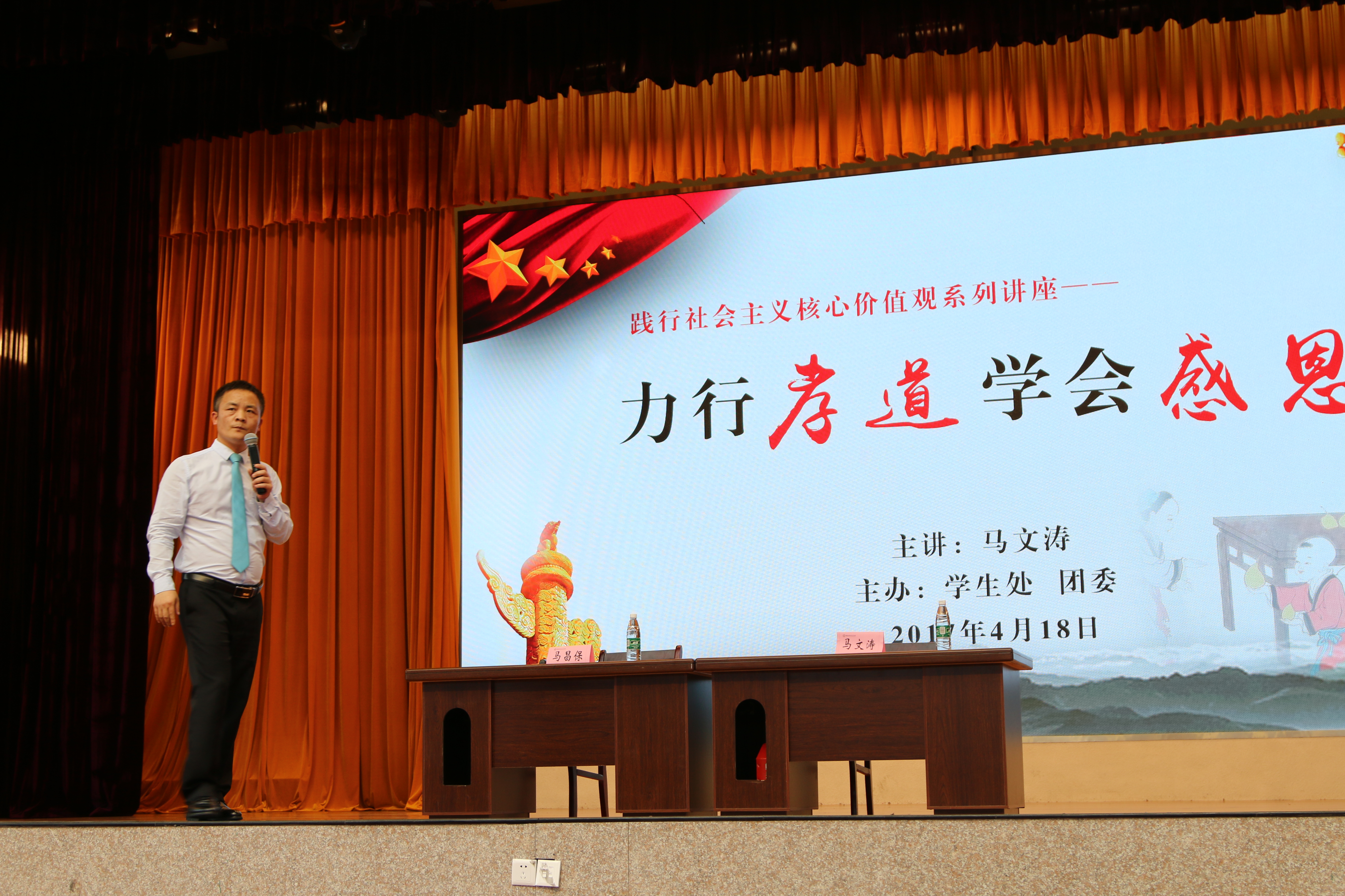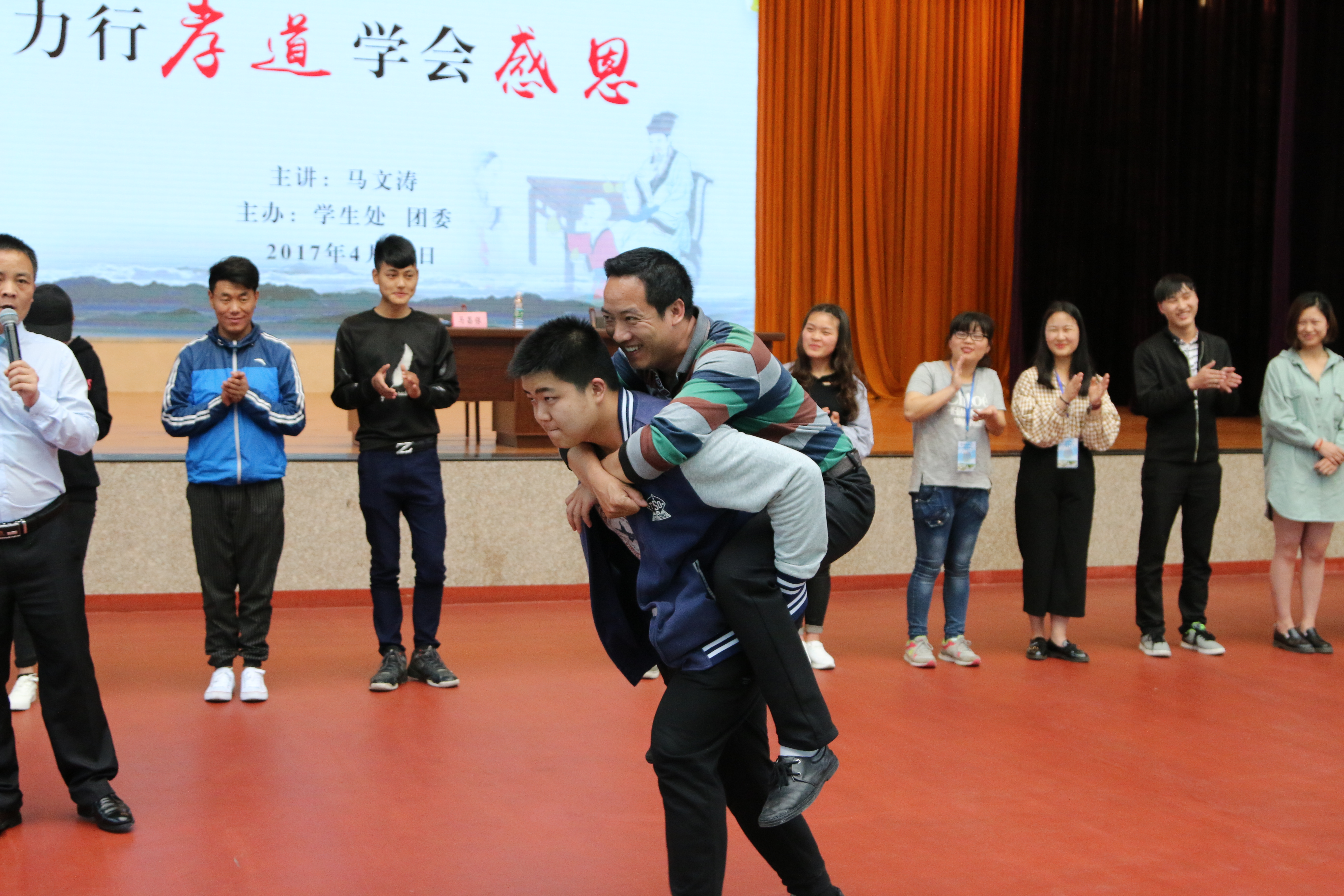 为强化学生感恩父母、尊师重教意识,4月18日下午,我院在文体馆举办“力行孝道,学会感恩”大型励志报告会,君之道青少年发展中心马文涛先生受邀主讲。副院长马昌保主持报告会,系(部)党总支书记、副书记、辅导员、班主任及学生代表聆听报告。