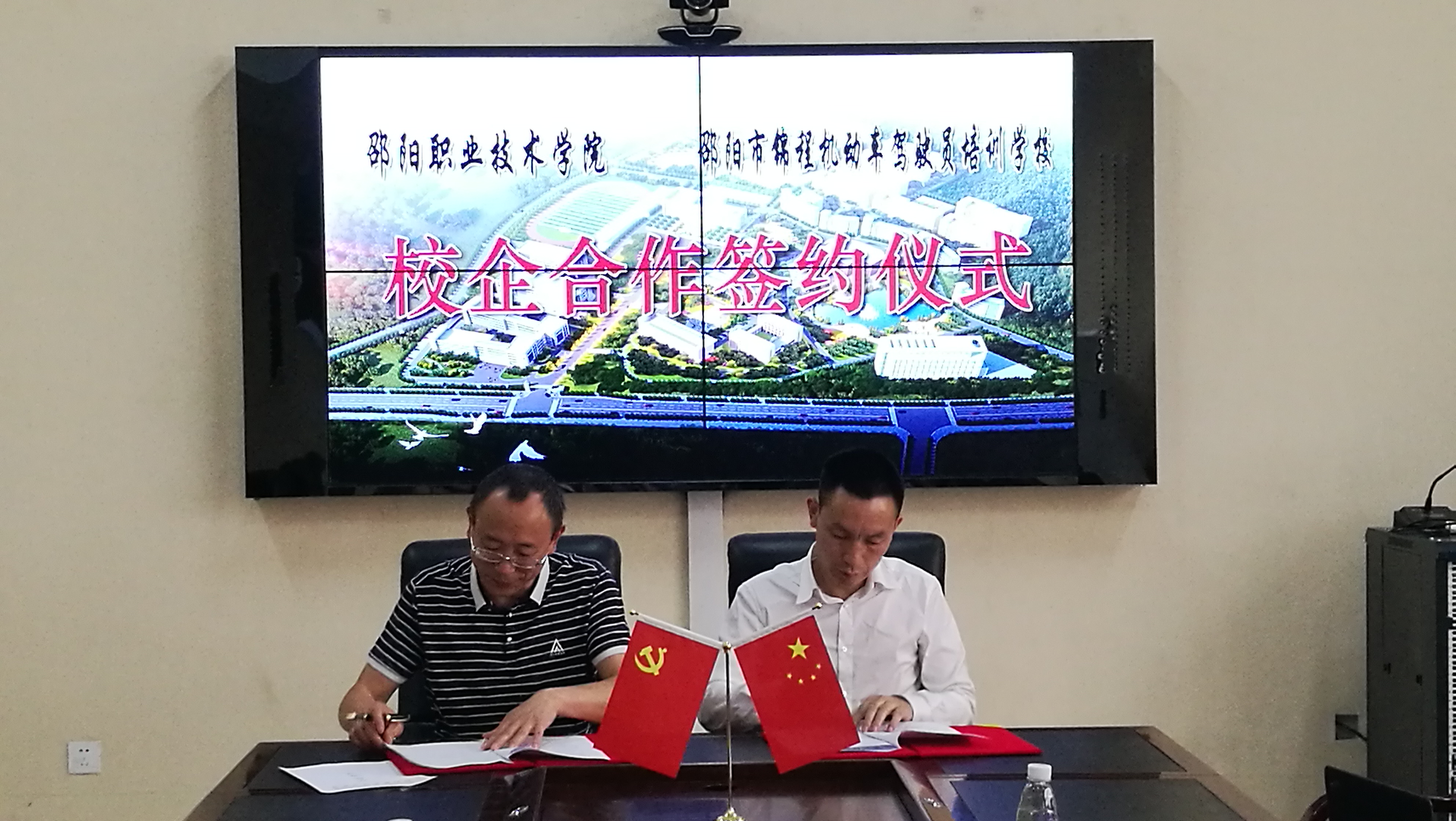 5月25日下午,我院在图书馆A313视频会议室与邵阳市锦程机动车驾驶员培训学校签订校企合作协议。学院副院长周平、锦程驾校董事长雷治高分别代表校企双方在协议上签字。党委副书记张远红、党政办公室副主任庾伟、机电工程系主任刘一兵、锦程驾校办公室主任王珍梅、招生办主任曾春红出席签约仪式。