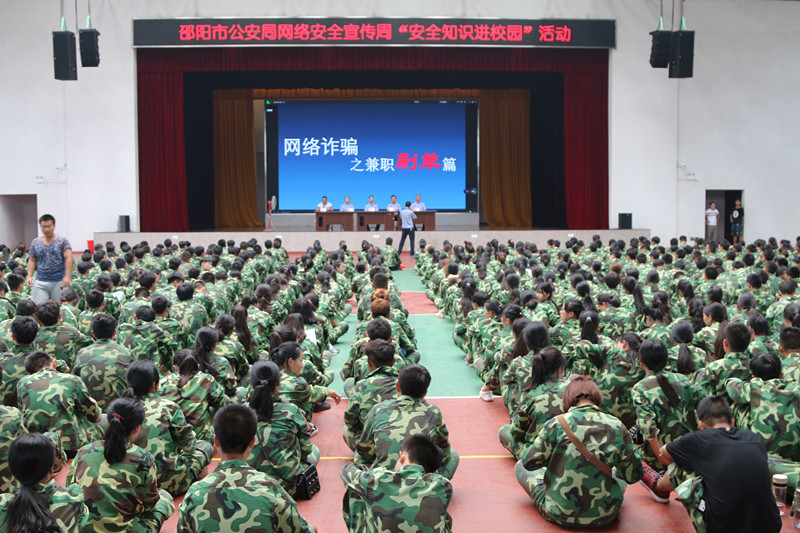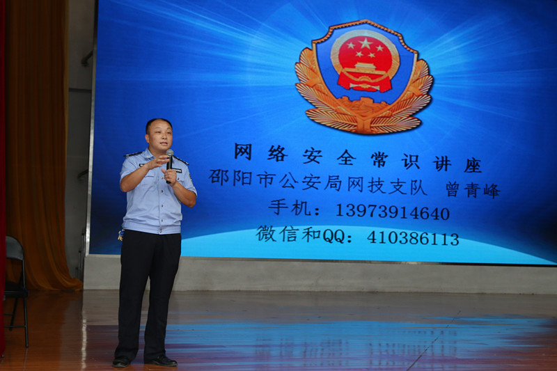 9月19日上午,邵阳市公安局网技支队应邀来我院举行网络安全知识讲座,市网技支队支队长罗银元,副支队长欧阳泽海,大队长莫柏青、曾青峰等来校指导。讲座由曾青峰主讲,学生工作处处长朱文华主持。学院部分老师和2017级2000余名新生聆听了讲座,院党委书记李小平会中察看了现场情况。