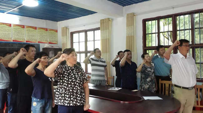 整个活动共有四项内容:1、宣讲党的基本知识,集体交纳党费;2、重温入党誓词。在党旗下,全体党员举起右手,握紧拳头,重温了入党誓词。誓言诤诤,撞击心灵,进行了一次深刻的党性洗礼;3、由学院扶贫工作队介绍金水村扶贫工作情况,集中学习国家扶贫工作政策;4、开展走访慰问活动。一是与扶贫对象面对面宣讲扶贫政策,传递扶贫正能量,激发群众脱贫积极性,为扶贫增强内动力;二是与扶贫对象深度沟通,了解他们的生产生活情况,传授青钱柳栽培技术和经营方法;三是开展慰问,对扶贫对象发放慰问品,对杨支光、段树荣、雷通杰、杨进修四名高龄共产党员每人发放慰问金200元。