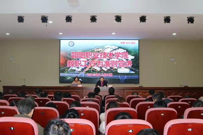 大会学习了《邵阳职业技术学院教职工行为准则》(简称《职院八条》),从《职院八条》出台的目的、出台的准则、谋篇布局的特点、核心内容分析四个维度进行了精准解读。会议要求全体教职工要提高政治站位,深刻领会准确把握其丰富内涵和核心要义,严格按其要求规范自己的行为,以身作则,模范带头,强化责任担当,做新时代有理想信念、有道德情操、有扎实学识、有仁爱之心的四有教师。