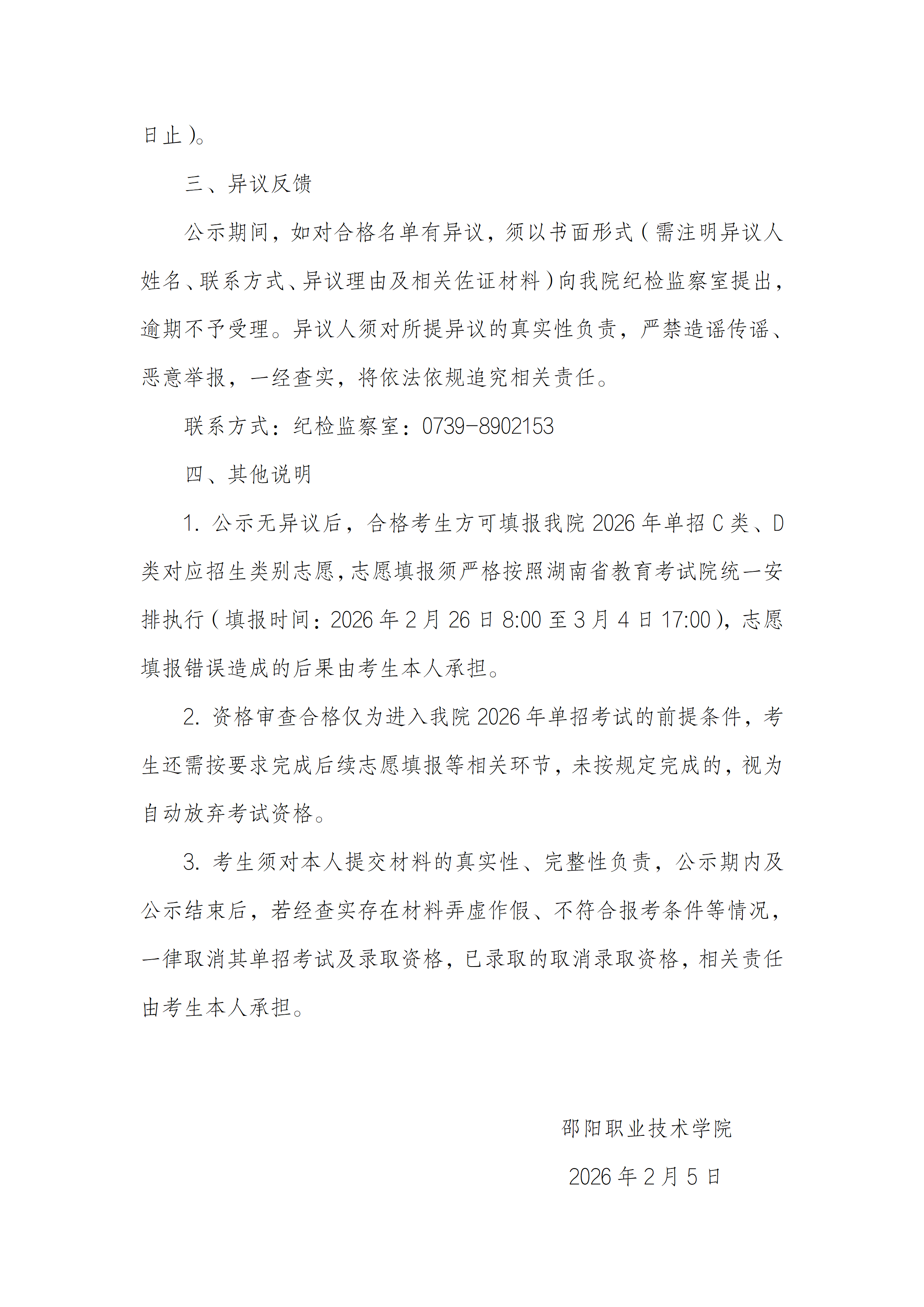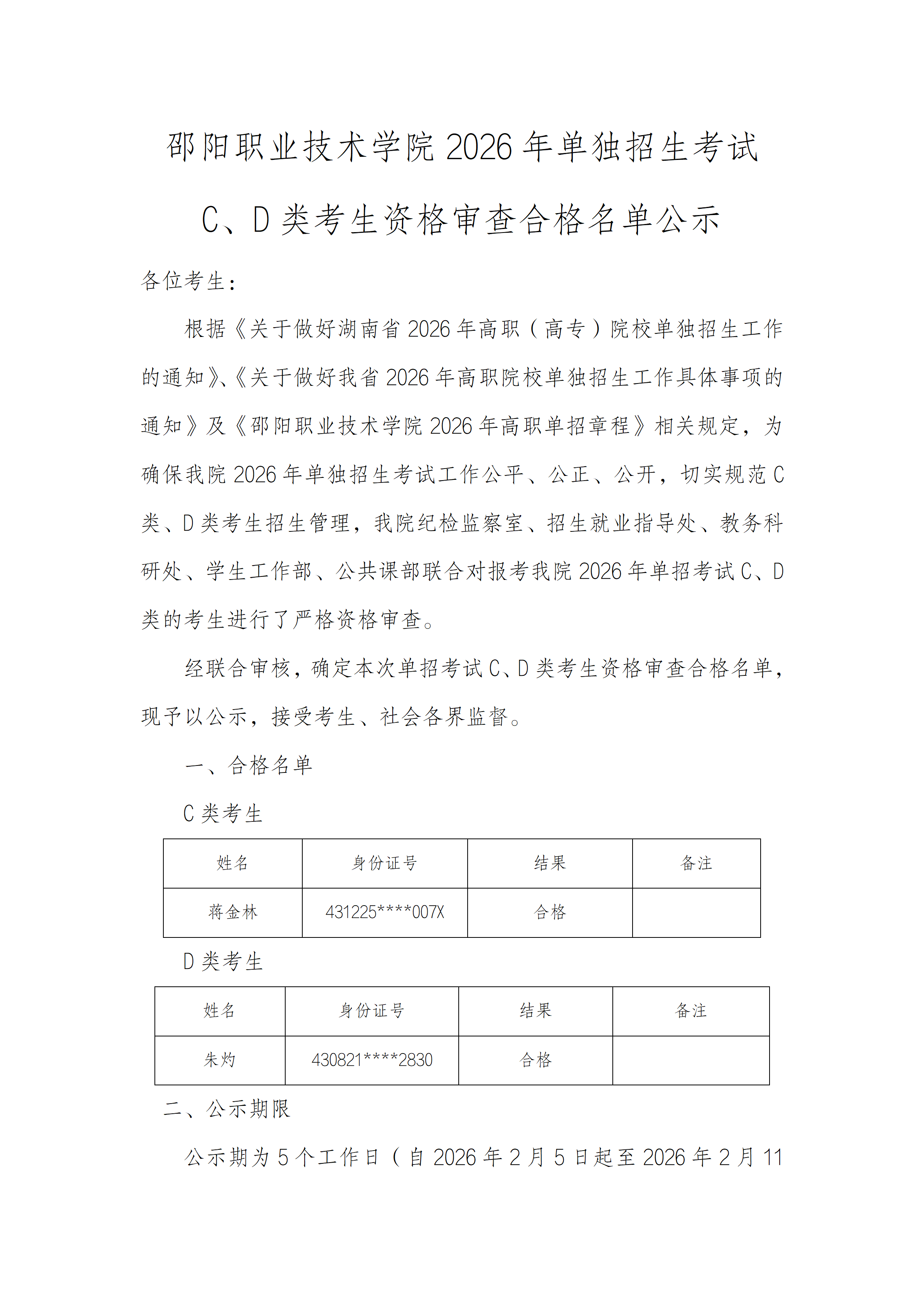 邵阳职业技术学院2026年单独招生考试 C、D类考生资格审查合格名单公示
