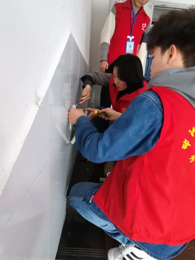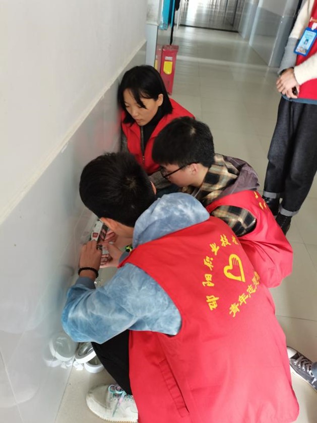 4月9号上午十二点半,在邓果老师的组织下,带领着电梯工程学院一些志愿者自发对学院11栋寝室的安全指示牌进行了检修、排查工作。