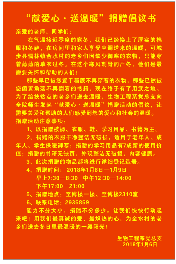 为了给学院驻村扶贫点城步县儒林镇金水村的贫困户送去温暖,帮他们度过寒冬, 1月8日至9日,生物工程系党总支发起了“献爱心、送温暖”捐赠活动,捐赠物品主要以被褥、衣物、鞋子等御寒物品和书籍为主。捐赠活动坚持自愿原则,积极发挥党员模范带头作用,倡导人人参与。