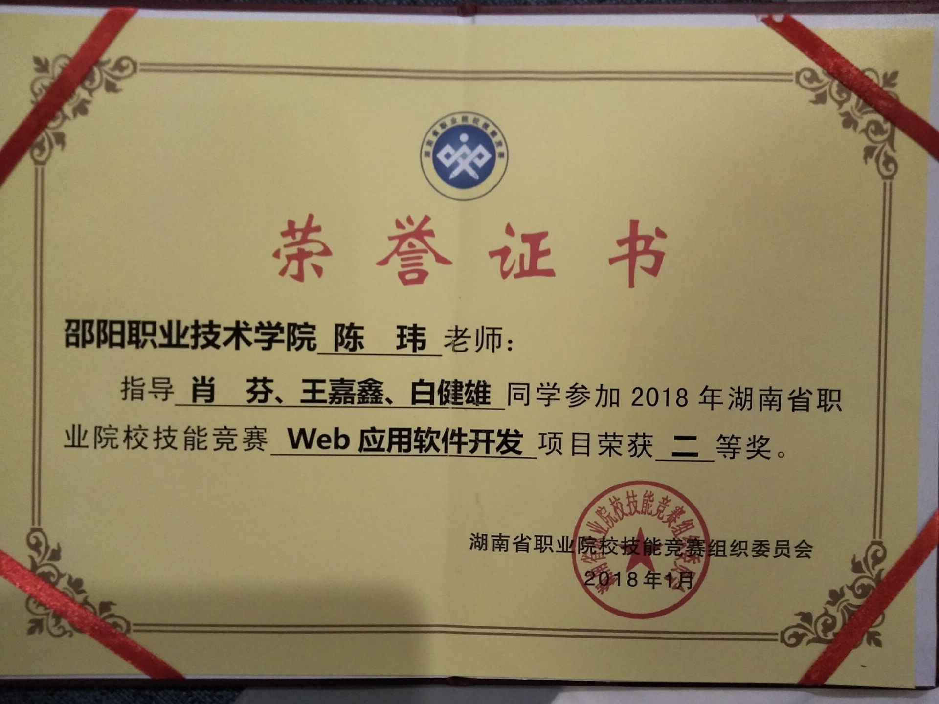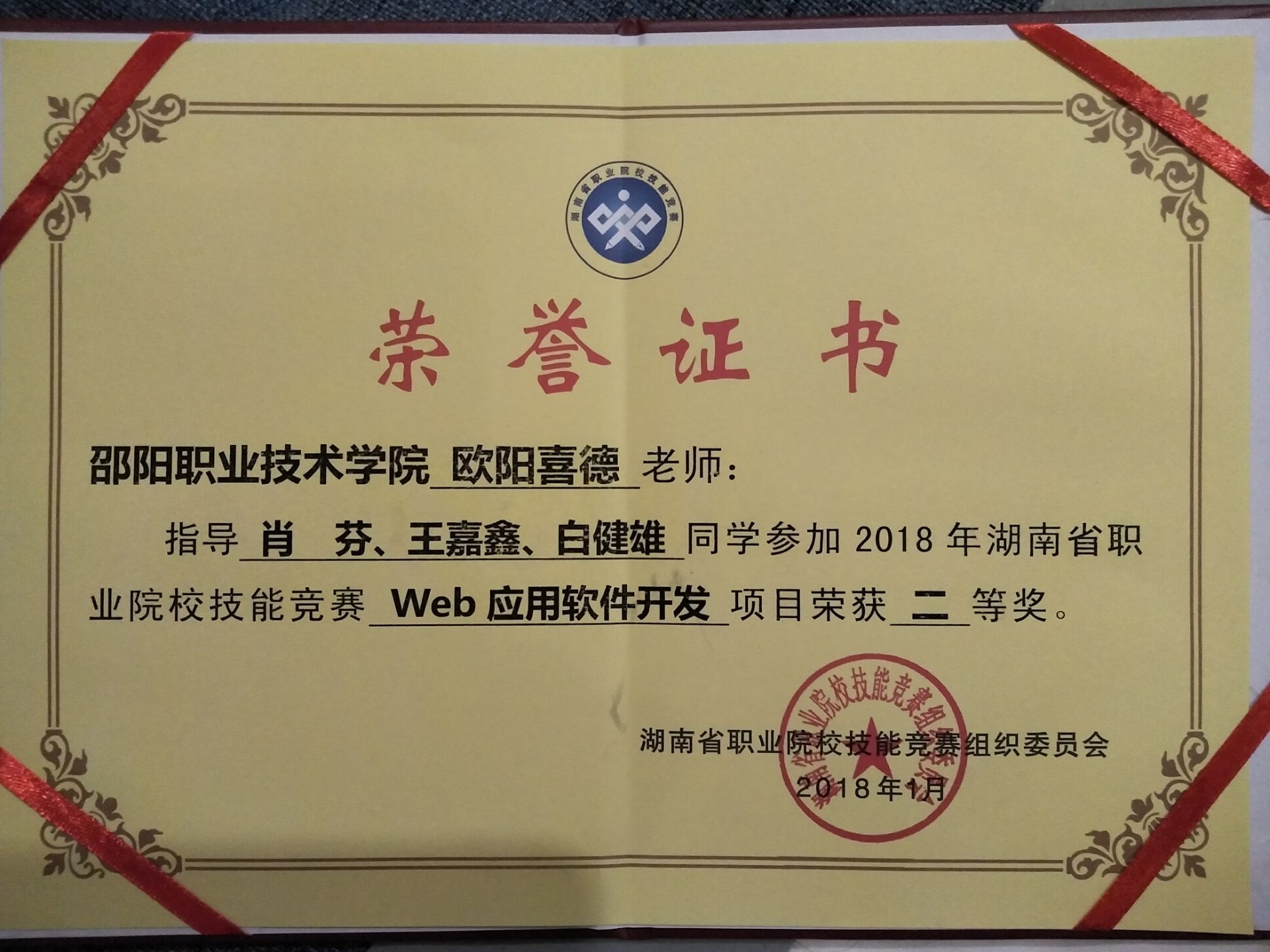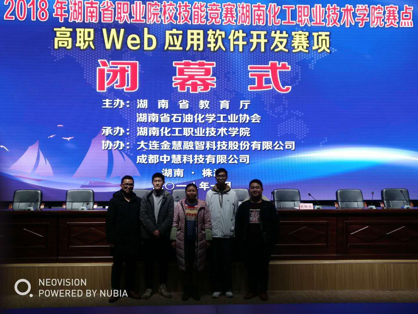 2018年1月16日,湖南省第一届高职Web应用软件开发技能大赛圆满结束,在陈玮、欧阳喜德老师的指导下,我院信息技术与创意系学生肖芬、白健雄、王嘉鑫组成的团队荣获二等奖,这是信息技术与创意系以工作室为依托,积极开展 “业务实战型”教学模式改革及以赛促学、引导学生自主学习的又一项成果。信息技术与创意系通过创新理实一体化教学模式,不断激发学生的专业兴趣,努力提高学生的实践操作能力,教学效果显著。这也是移动互联应用技术专业第一届学生首次参加的省级赛事。(信息技术与创意系)