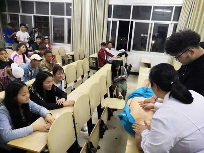 为了加强学生在遇到意外伤害事故时的急救能力,4月8日晚,信息技术与创意系携手市中心医院志愿者团队通过讲课及模拟演示的方式对学生急救知识的培训。