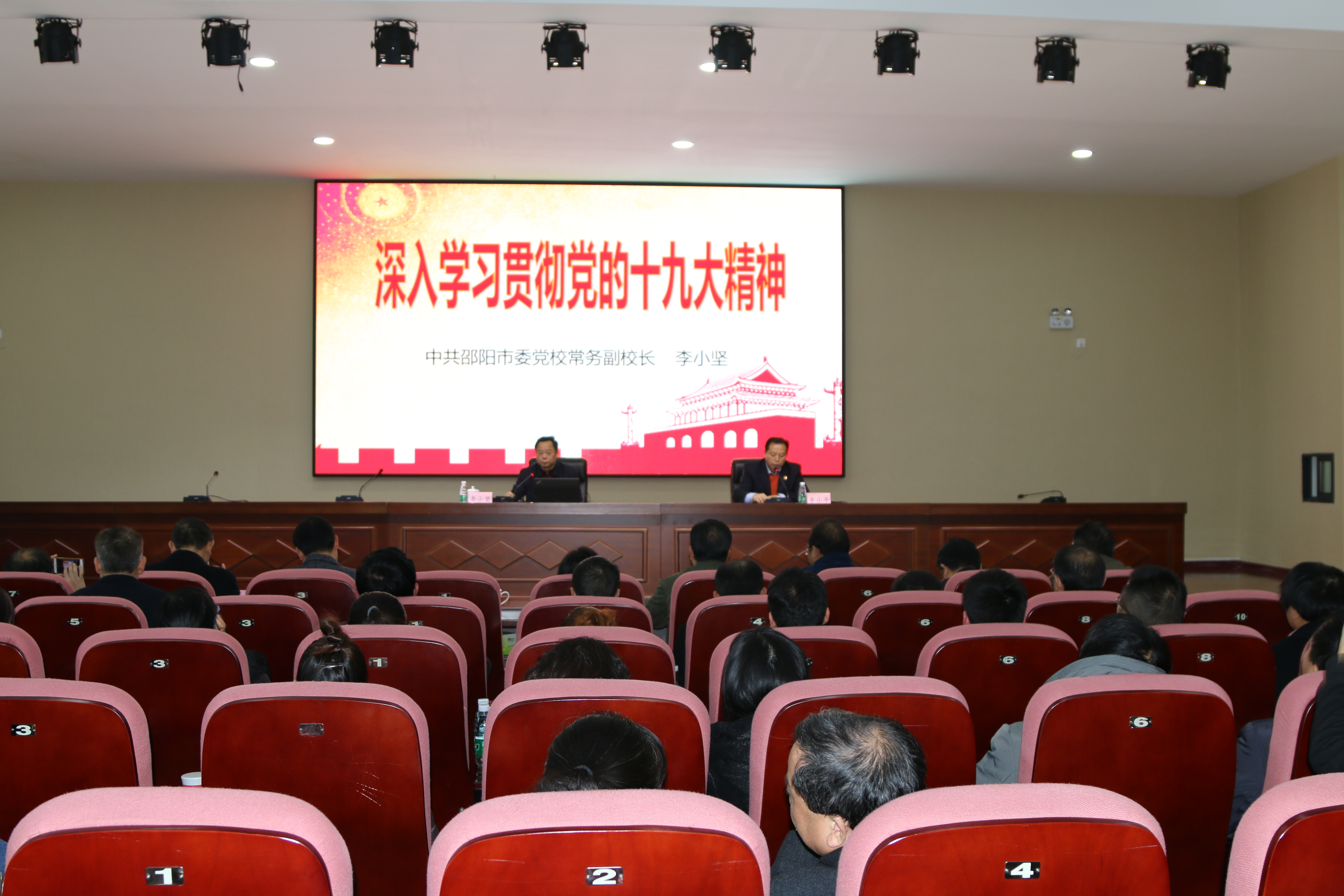 12月1日上午,深入学习传达贯彻党的十九大精神宣讲大会在学院图书馆五楼学术报告厅举行,党委书记李小平主持,邵阳市委党校常务副校长李小坚主讲。全体院级领导和中层干部、教职工党员、部分学生党员聆听了宣讲。