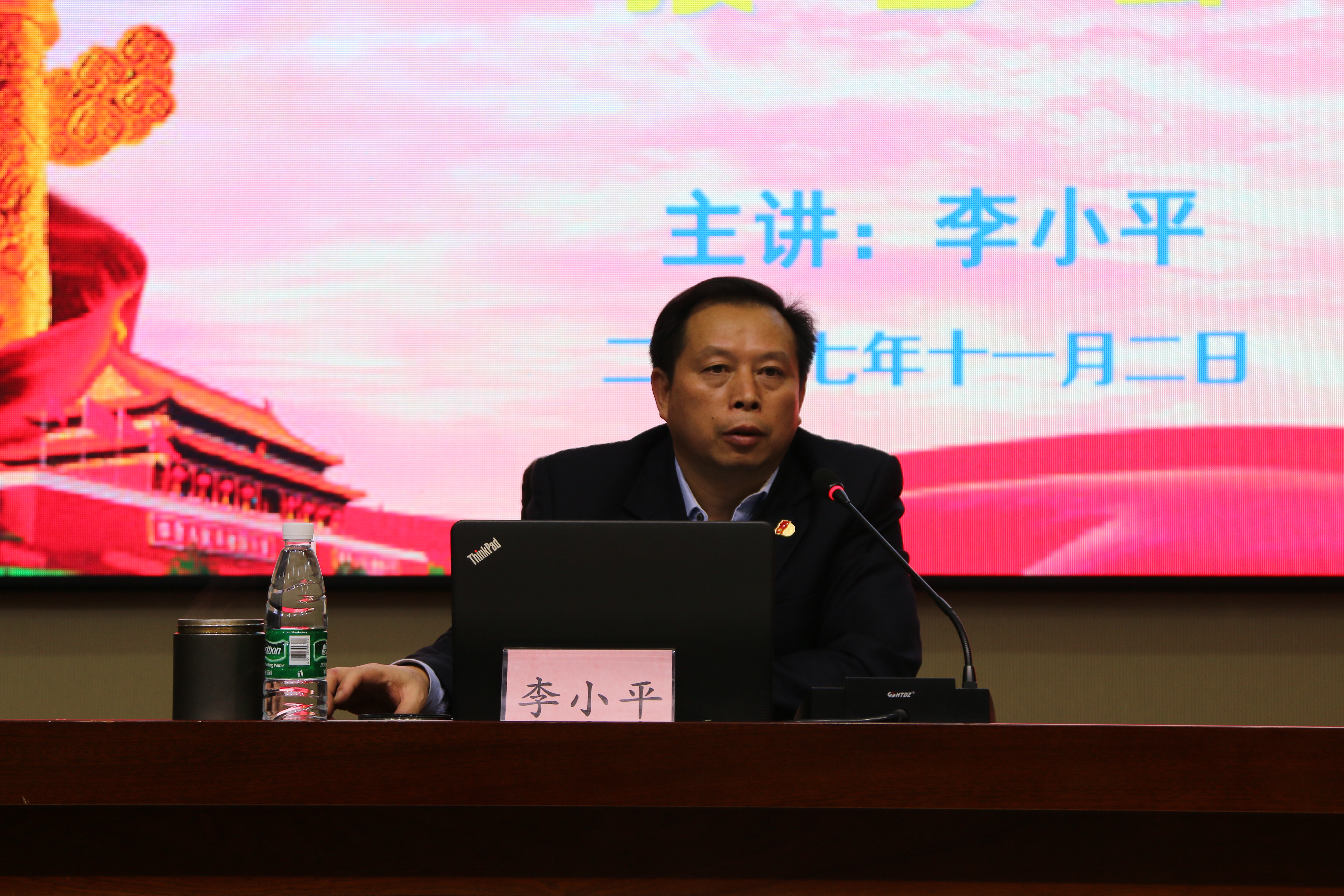 李小平以十九大报告“不忘初心,牢记使命,高举中国特色社会主义伟大旗帜,决胜全面建成小康社会,夺取新时代中国特色社会主义伟大胜利,为实现中华民族伟大复兴的中国梦不懈奋斗。”为切入点,从新时代坚持和发展中国特色社会主义的基本方略、新的伟大工程、新征程、新发展理念、新时代党的建设总要求等方面对十九大报告做了较为全面的解读。台下的师生认真聆听,细心做笔记,学习十九大报告的深刻内涵。