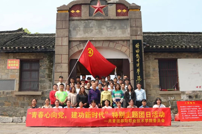 4月23日,为庆祝中华人民共和国成立70周年、纪念五四运动100周年,大力弘扬爱国主义精神,增进广大在校大学生爱党爱国情怀,根据团中央在全团部署开展主题宣传教育实践活动的通知精神,邵阳职院团委组织大学生团员青年,在邵阳县塘田战时讲学院旧址,举行“青春心向党,建功新时代”主题团日活动”。