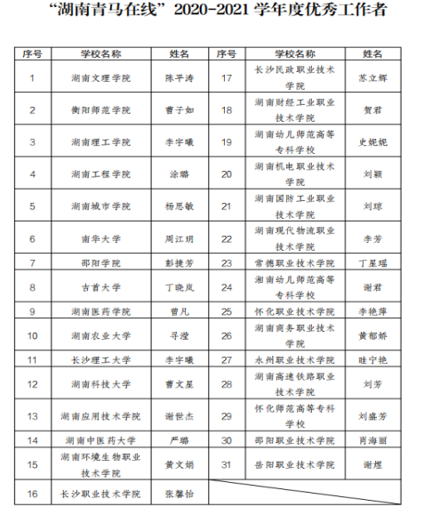 只要种下了希望的种子,用心浇灌,就一定能够发芽。事实证明,辛勤的浇灌总能够得到回报。果然,我们之前种下的“青马工程种子”,现已全面开花,学院359名优秀大学生,自2020年11月至2021年5月,经过历时7个月的理论学习、参与社会实践和调研,完成了湖南省青马工程培训班的学习,并顺利结业。近日,共青团湖南省委学校部、湖南省学生联合会秘书处《关于表彰2020-2021学年度“湖南青马在线”优秀组织单位、优秀工作者、优秀学员、主题社会实践活动优秀作品的决定》公布。经评选,我院获得“湖南青马在线”2020-2021学年度优秀组织单位,团委书记肖海丽获得“湖南青马在线”2020-2021学年度优秀工作者称号,李步高等17位同学获得“湖南青马在线”2020-2021学年度优秀学员称号,这些均是我院青马工程培训新的突破。